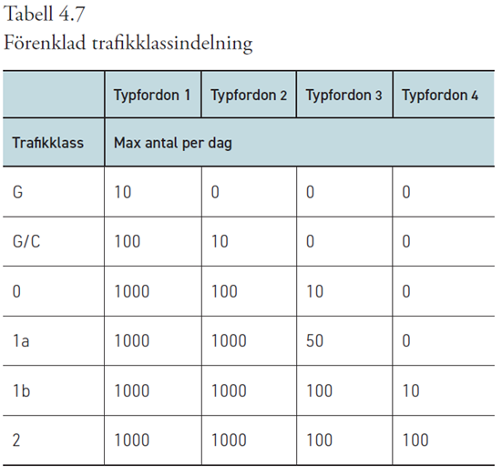 I stadsmiljö är övervägande delen av trafiken lätta fordon, d v s fordon med totalvikt under 3,5 ton. Sådan trafik bidrar endast i begränsat omfattning till överbyggnadens tillståndsutveckling (exempelvis spårbildning) jämfört med tyngre trafik. I den förenklade trafikklassbestämningen delas trafiken in i fordonsgrupper med ungefär samma totalvikt och axelkonfigurationer enligt tabell 4.6. Lämplig trafikklass väljs enligt tabell 4.7. Tabell 4.7 baserar sig på 20 års dimensioneringsperiod. Tillåtna total- och axellaster finns i Transportstyrelsens skrift Lasta lagligt.