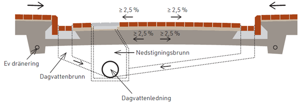 Vattenavrinningen är alltid viktig att lösa vid gatu- och vägprojektering. Kvarstående vatten i konstruktionen, speciellt i sättmaterialet, innebär att besvärande skador lätt uppkommer. En effektiv avrinning skapas om den tvärgående lutningen är större än 2,5 procent. För trafikerade gator är 2,5 procents lutning inget problem att uppnå. Ur tillgänglighetsperspektiv och i trånga utrymmen kan dock 2,5 procents lutning vara svårt att uppnå, och mindre lutning kan då accepteras. Men då är det viktigt att lämpliga avrinningsvägar skapas så att vatten inte blir stående i konstruktionen.